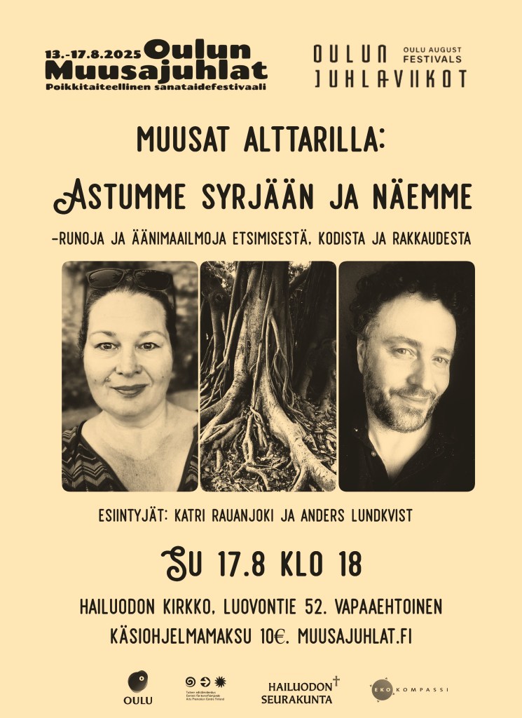 ”Astumme syrjään ja näemme” on runo- ja äänitaide-esitys, jonka tein yhdessä mieheni, ruotsalaisen runoilija ja äänitaiteilija Anders Lundkvistin, kanssa. Sen teemoina ovat matka, rakkaus ja koti. Esityksessä ne sekoittuvat toisiinsa tarkentaen yksittäisiin hetkiin ja laajentuen pohtimaan asiaa jokaisen kannalta erikseen. Maantieteellisesti tekstit kurottavat useisiin suuntiin: toisaalta ne ompelevat kiinni välimatkaa Merenkurkun molemmin puolin ja toisaalta valaisevat kulkijan tietä Andalusiassa. Ne tutkivat hidasta muuttumista, päätöksiä: milloin talosta tulee pysyvä asunto, milloin koti.